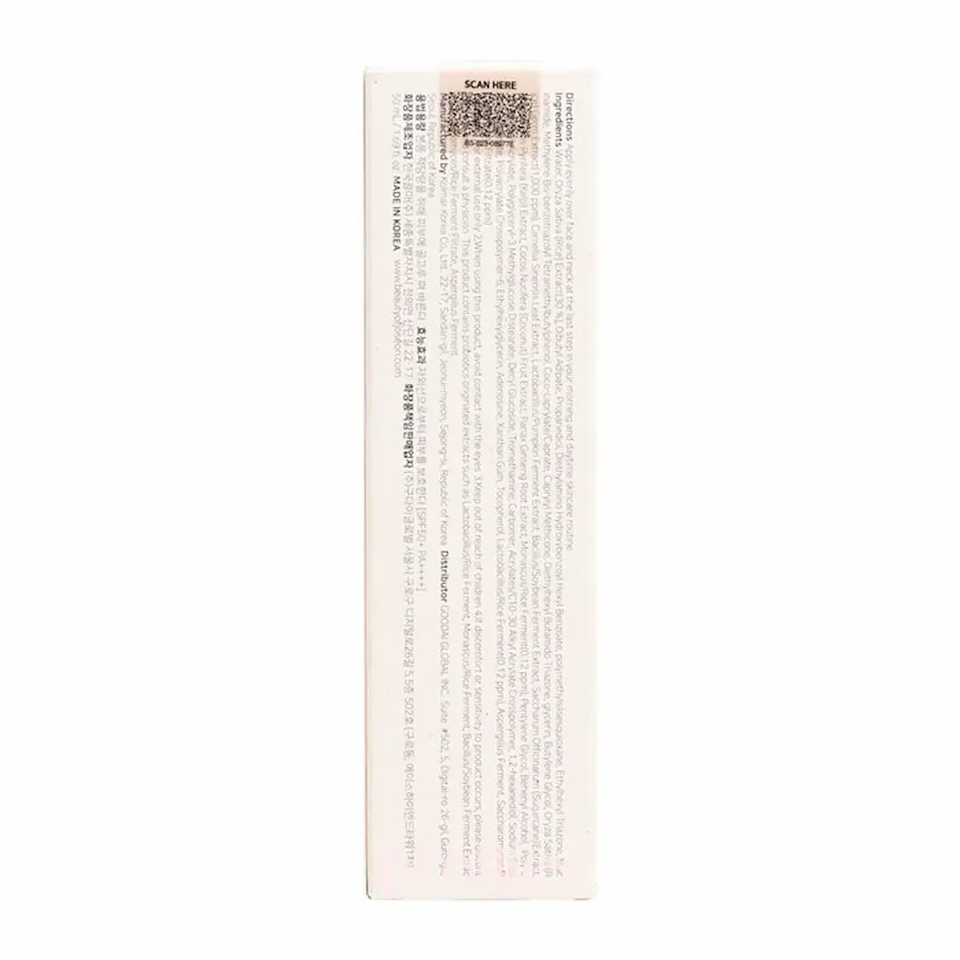 Water, Oryza Sativa (Rice) Extract (30%), Dibutyl Adipate, Propanediol, Diethylamino Hydroxybenzoyl Hexyl Benzoate, Polymethylsilsesquioxane, Ethylhexyl Triazone, Niacinamide, Methylene Bis-Benzotriazolyl Tetramethylbutylphenol, Coco-Caprylate/Caprate, Caprylyl Methicone, Diethylhexyl Butamido Triazone, Glycerin, Butylene Glycol, Oryza Sativa (Rice) Germ Extract, Camellia Sinensis (Green Tea) Leaf Extract, Lactobacillus/Pumpkin Ferment Extract, Bacillus/Soybean Ferment Extract, Saccharum Officinarum (Sugarcane) Extract, Macrocystis Pyrifera (Kelp) Extract, Cocos Nucifera (Coconut) Fruit Extract, Panax Ginseng Root Extract, Monascus/Rice Ferment, Pentylene Glycol, Behenyl Alcohol, Poly C10-30 Alkyl Acrylate, Polyglyceryl-3 Methylglucose Distearate, Decyl Glucoside, Tromethamine, Carbomer, Acrylates/C10-30 Alkyl Acrylate Crosspolymer, 1,2-Hexanediol, Sodium Stearoyl Glutamate, Polyacrylate Crosspolymer-6, Ethylhexylglycerin, Adenosine, Xanthan Gum, Tocopherol, Aspergillus Ferment, Saccharomyces/Rice Ferment Filtrate.